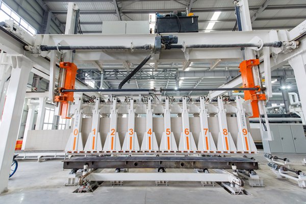 Los productos acabados se elevarán sujetando el transportador aéreo para dejar atrás la pared lateral, y ésta se transferirá a la siguiente etapa de producción. Los bloques se colocarán en el exprimidor de bloques móvil, y los paneles se colocarán en el transportador de paneles.